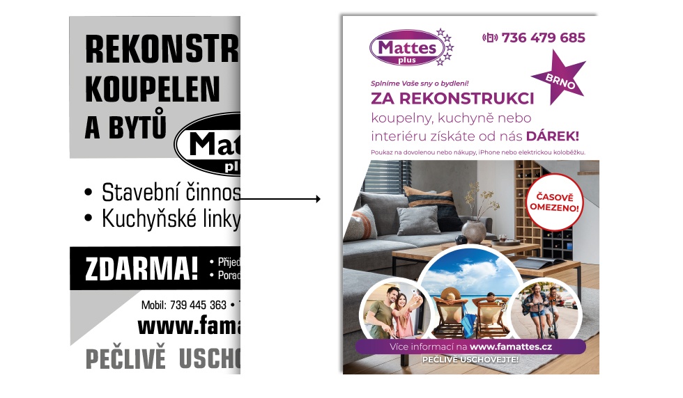 • Nový design reklamních materiálů, včetně letáků, polepů výloh a polepů aut